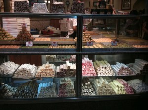 The VISUAL appeal of a display of Turkish Delight is another story. During a stroll on my first night in Istanbul, I passed by a shop window full of this candy, and I found the color-burst irresistible. Before long I would start seeing patterns in displays such as this — not only of Turkish Delight but of spices, carpets, gemstones, ice cream…